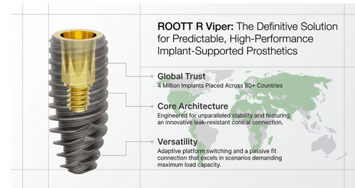 ROOTT R - VIPERThe Definitive solution for Predictable, High Performance ImplantGlobal Trust4 Million Implants placed across 80+ CountriesCore ArchitectureEngineered for unparalleled stability and featuring an innovative leak-resistant conical connectionVersatilityAdaptive platform switching and a passive fit connection that excels in scenarios demanding maximum load capacity